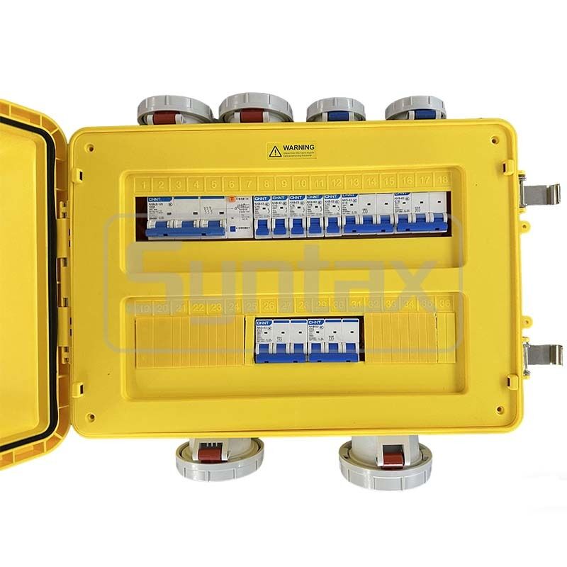 صناديق توزيع الطاقة المؤقتة للاستخدام في الأحداث المباشرة، الأحداث الرياضية، السينما والتلفزيون، تصنيف 125A، 400VAC، 3P+N+E IP67 مقاومة للماء. المدخل هو 5P 125A 400v ثلاثية المراحل IP67،الذي يحميه RCBO 3P 125A 30mAالمقابس الخارجة هي 1 رقم 5P 63A 400v IP67 المقابس ذات النوع المستقيم المثبت على اللوحة ، محمية بواسطة 1 رقم 3P 63A MCB ، و 1 رقم 5P 32A 400v IP67 المقابس ذات النوع المستقيم المثبت على اللوحة ،محمية بموجب 1 رقم 3P 32A MCB، و 1 رقم 5P 16A 400v IP67 لوحة مثبتة عابرة ، محمية بواسطة 1 رقم 3P 16A MCB ، و 2 رقم 3P 32A 220v IP67 لوحة مثبتة عابرة ، محمية بواسطة 2 رقم 1P 16A MCB ،و 3 رقم 2P + E 220v 16A سوكت شوكو أحادي المرحلة (النوع الألماني)، محمية بواسطة 3 رقم 1P 16A MCBs. الصناديق مصنوعة من PC و IP67 مقاومة للماء، والتي هي مثالية للمناسبات وخاصة للمسرح. يمكننا تخصيص صناديق توزيع الطاقة بنيت حسب الطلب.