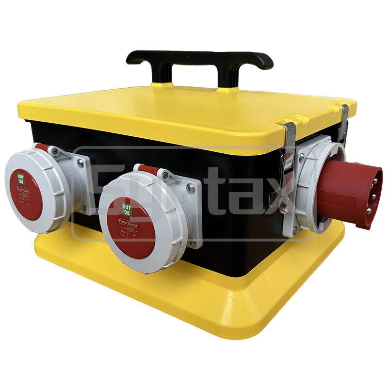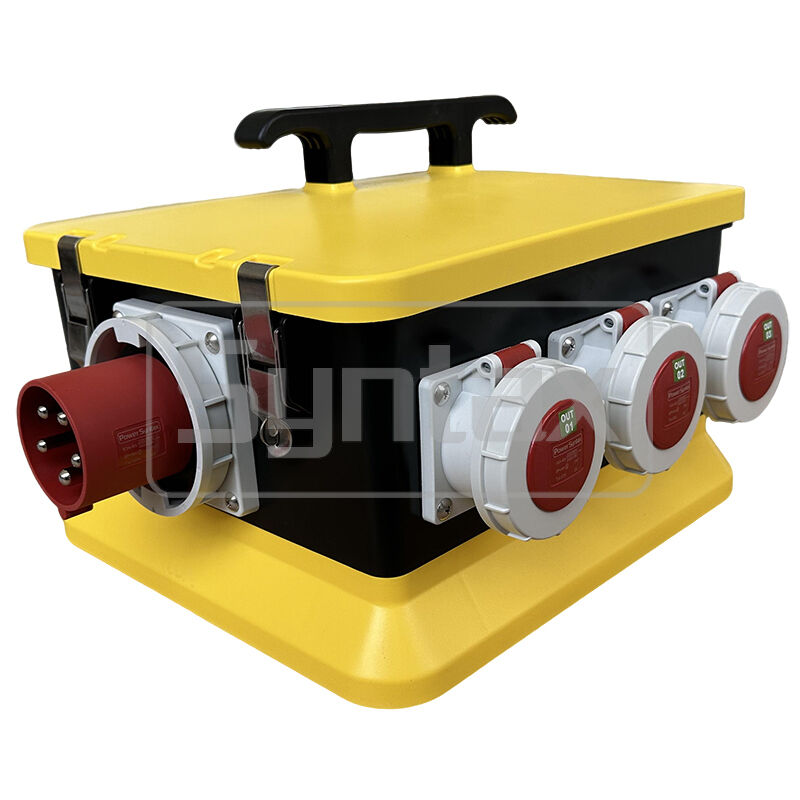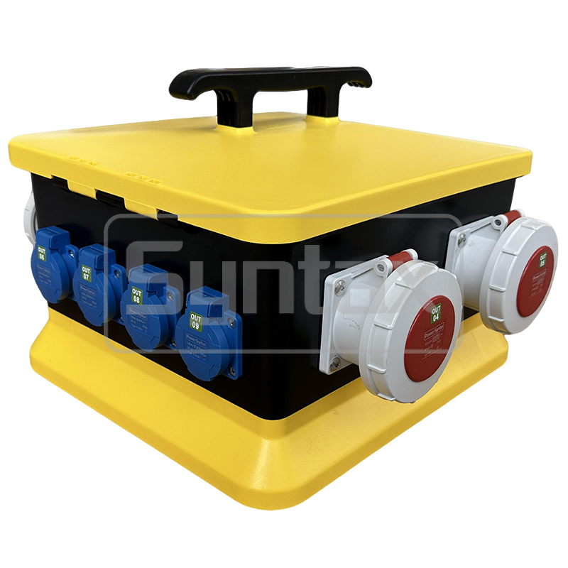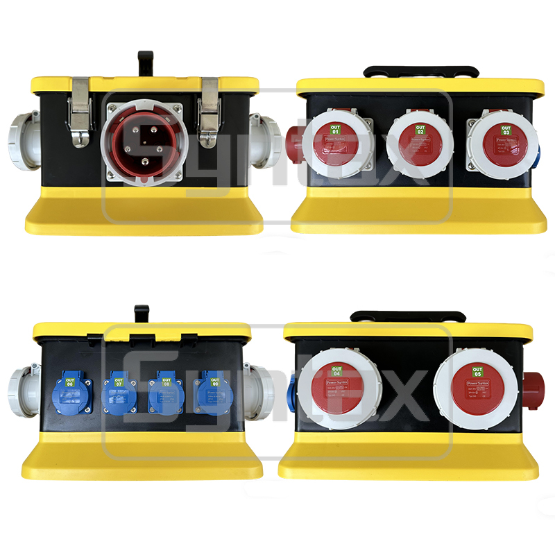 لوحة التوزيع المحمولة القياسية CEE هذه مناسبة للاستخدام الداخلي أو الخارجي، وهي مصنفة بـ 63 أمبير، 400 فولت تيار متردد، 3P+N+E IP67 محمية من العوامل الجوية. المدخل الوارد هو 5P 63A 400v ثلاثي الأطوار IP67، والذي يحميه RCD 4P 63A 30mA. المقابس الخارجة هي 2 مقبس من النوع المستقيم المثبت على اللوحة 5P 32A 400v IP67، محمية بواسطة 2 مقبس 3P 32A MCBs، و 3 مقابس من النوع المستقيم المثبت على اللوحة 5P 16A 400v IP67، محمية بواسطة 3 مقابس 3P 16A MCBs، و 4 مقابس Schuko أحادية الطور 2P+E 220v 16A (النوع الألماني)، محمية بواسطة 4 مقابس 1P 16A MCBs. الصناديق مصنوعة من الكمبيوتر الشخصي ومقاومة للماء IP67، وهي مثالية للأحداث خاصة للمسرح. يمكننا تصميم صناديق توزيع الطاقة حسب الطلب.