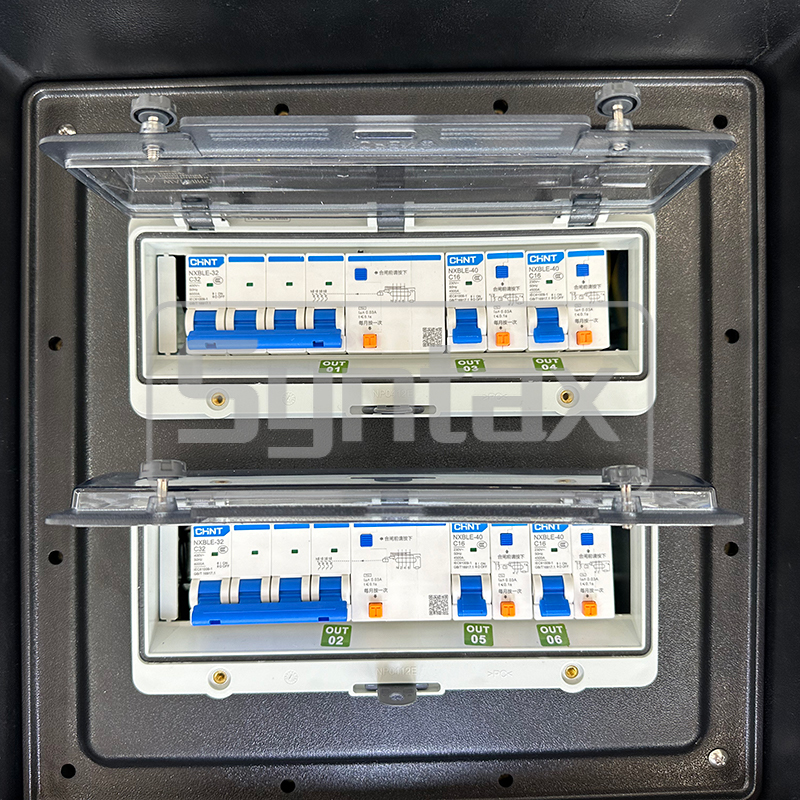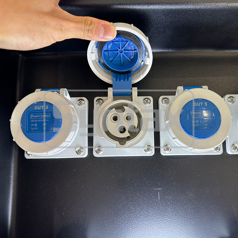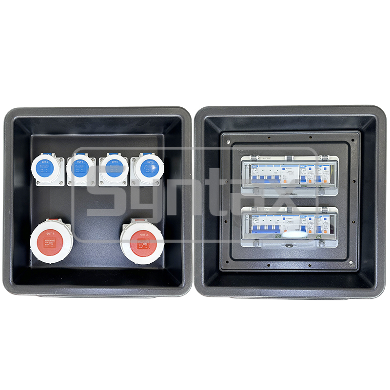 | الدائرة الخارجة 1 | 2 × 5P 32A 400V IP67 المقابس المثبتة على اللوحة ، محمية بواسطة 2 × 4P 32A 30mA RCBOs |