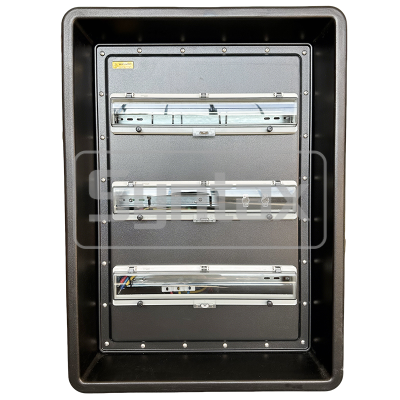 | الخارج 1-6 | 6×3P 16A 220V مقابس مثبتة على اللوحة IP67، محمية بواسطة 6×1P+N 16A 30mA RCBOs |